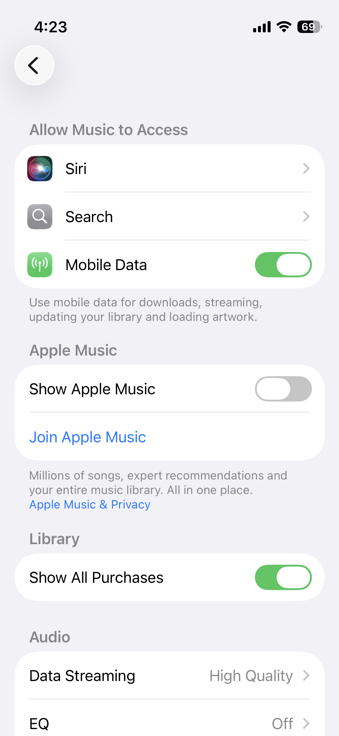 In Settings, I have disabled the "Show Apple Music" toggle. I have also enabled the "Show All Purchases" toggle. These settings have been like this for years.