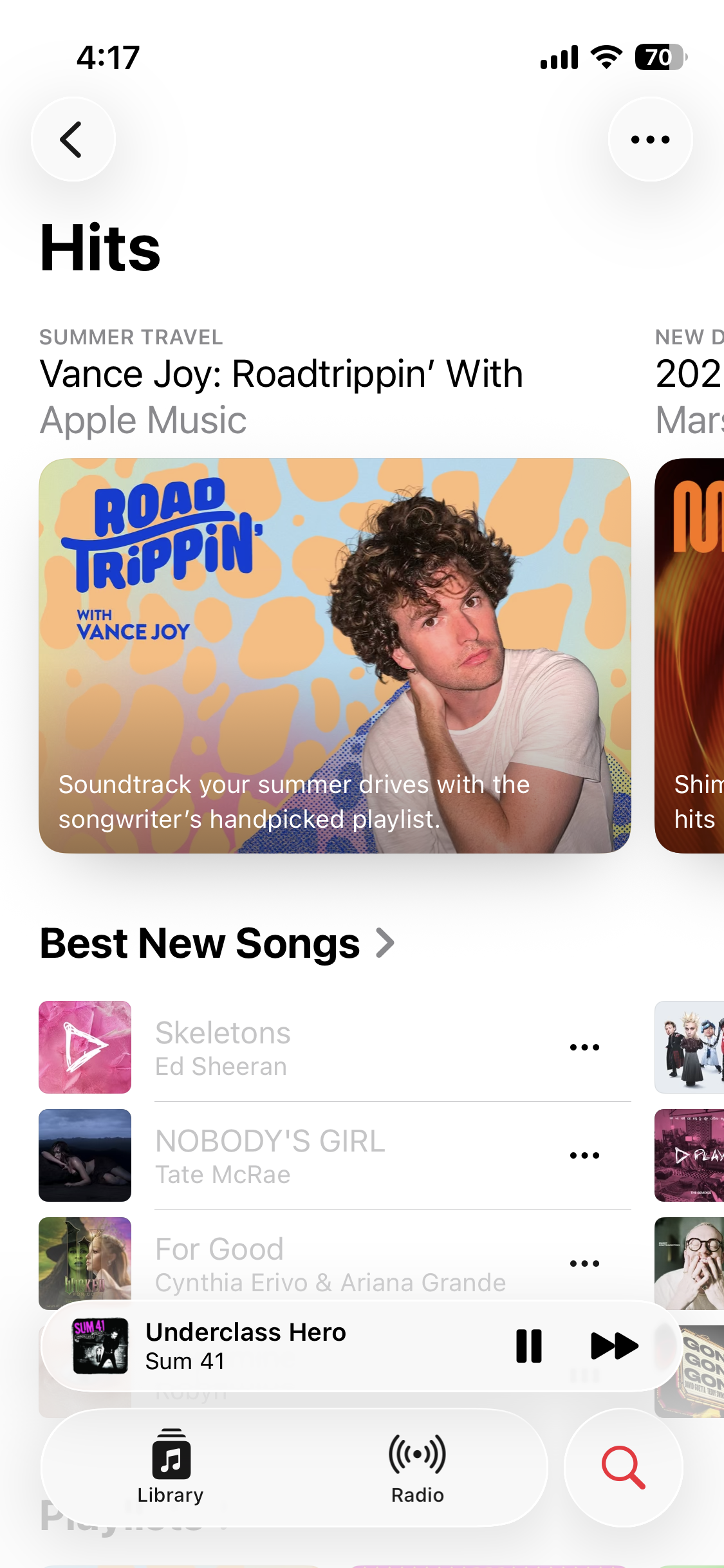 I get sent to a Store-like page containing dozens of links to songs that I can't play. Tapping any of the greyed-out links pops a modal asking me... to pay for Apple Music.